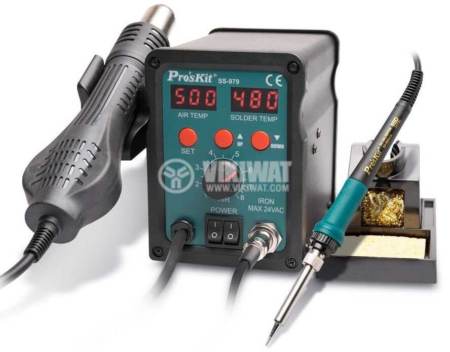 Станция за запояване и горещ въздух, SS-979E от PRO'S KIT с мощност на запояване 60 W, мощност горещ въздух 700 W, температурата на запояване от 200°C до 480°C и температурата на горещия въздух от 100°C до 500°C.