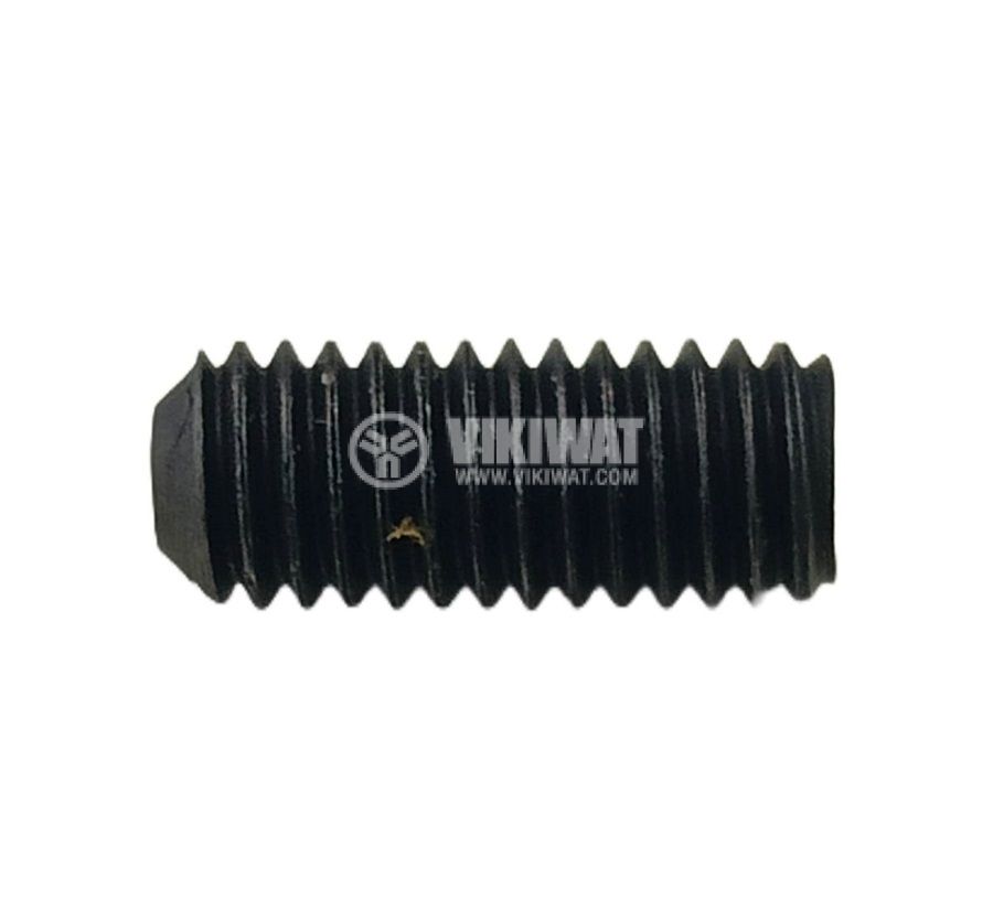 Стопорен винт за метал, с размери 5x12 mm, за завиване с ключ имбус шестограм. Стопорният винт е предназначен за осигуряване на на връзка между детайли или части от мебели осигуряващ неподвижност.