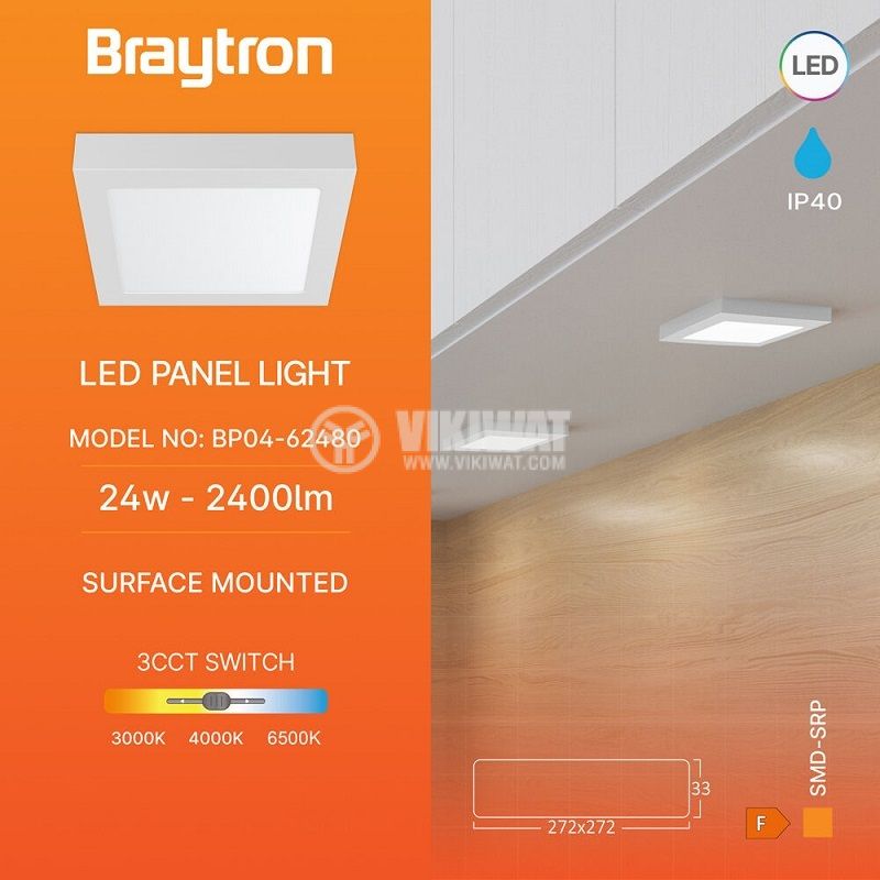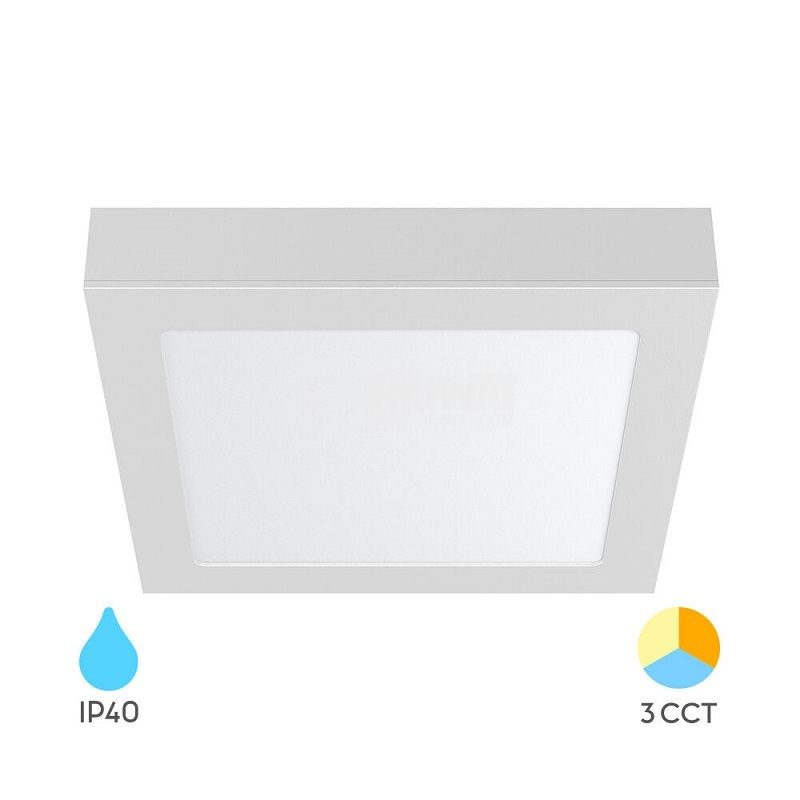 Square surface LED ceiling panel with power consumption 24 W, luminous flux 2400 lm and 3 shades of white light (warm, natural, cold). Suitable for office and business buildings, schools, hospitals. For indoor and outdoor use IP40. Non-dimmable.