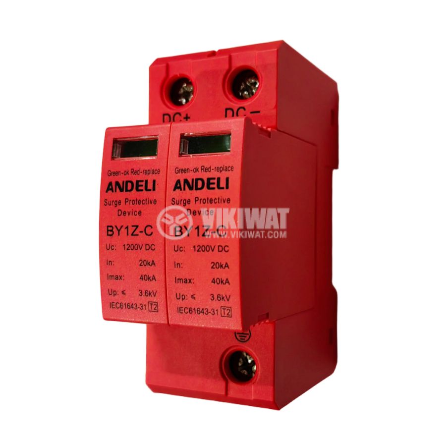athodic arrester BY1Z-C, two-polar, designed for DIN rail mounting, nominal voltage 1200 VDC and maximum discharge current 40kA. Suitable for solar systems.