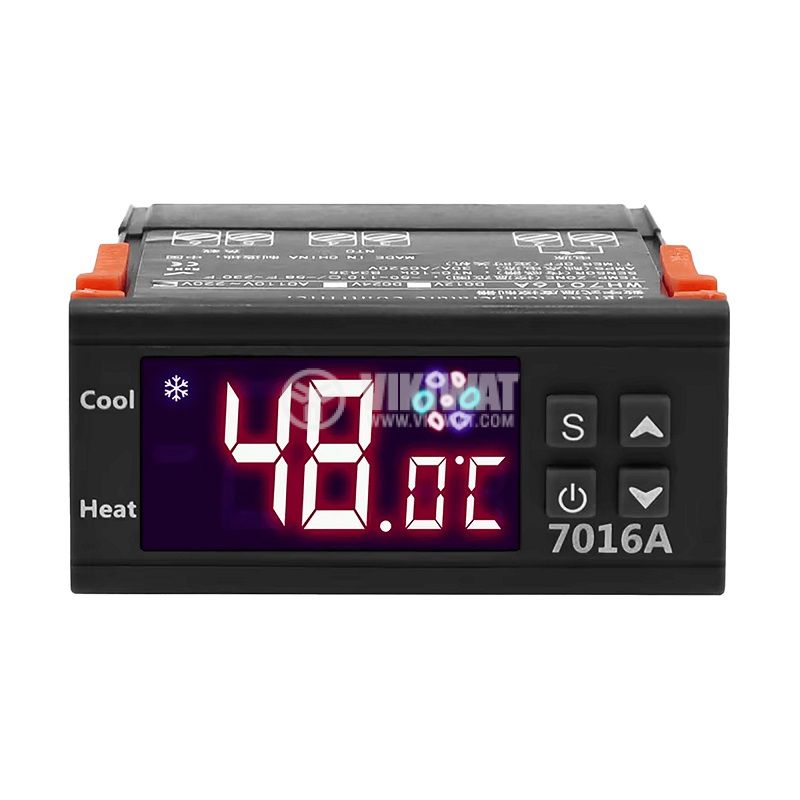 Термоконтролерът модел WH7016A е високоефективен и надежден, за измерване и поддържане на температура, захранващо напрежение 230 VAC s максимален изходен ток 30 A, товароносимост до 6600 W на консуматора, диапазон на работа от 0 до 50 °C.