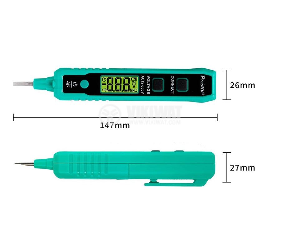 Безконтактен детектор на напрежение, дистанционен фазомер, NT-320 от PRO'S KIT, с LED дисплей и фенерче, предназначен за замерване на напрежението в електрически системи с напрежение от12 VAC до 300 VAC. Захранване от 1x ААА батерия.