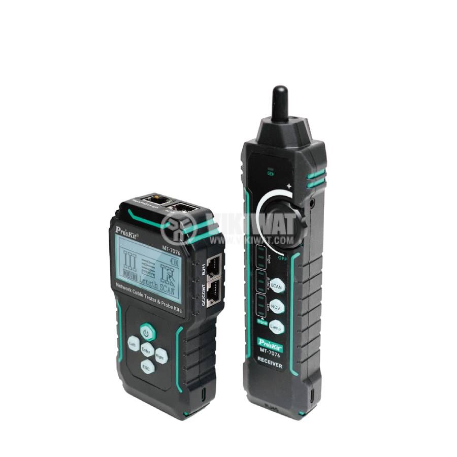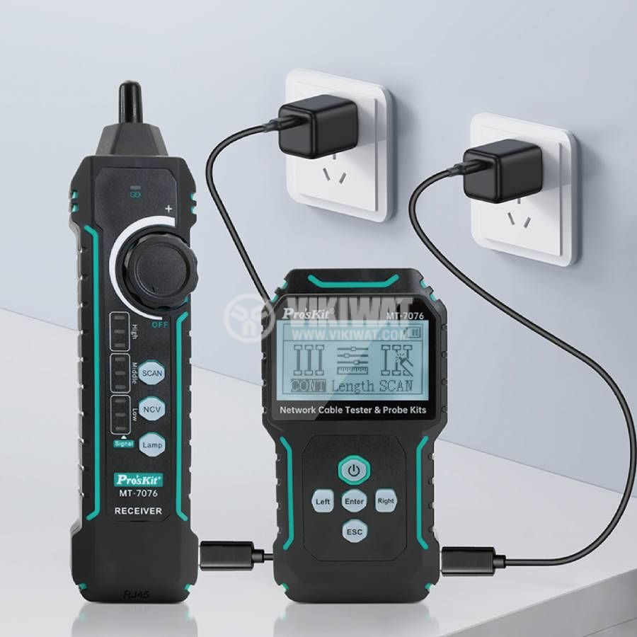 Многофункционален тестер MT-7076 от PRO'S KIT за мрежови (LAN) кабели кабел (cat5/6/7). Специално проектиран за проверка за отворена верига, непрекъснатост на проводници, шум, PoE, загуба на данни и нарушение на информацията спрямо дължината на кабела. Захранване батерия Li-Ion 1400 mAh зареждана през USB.