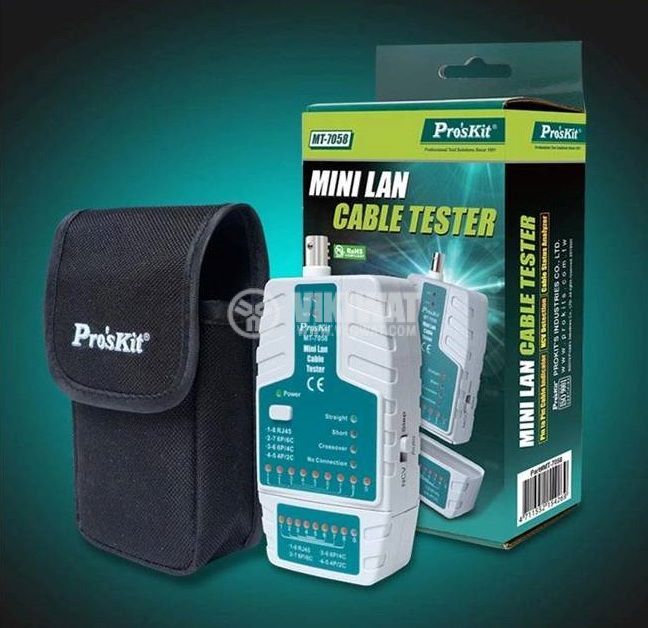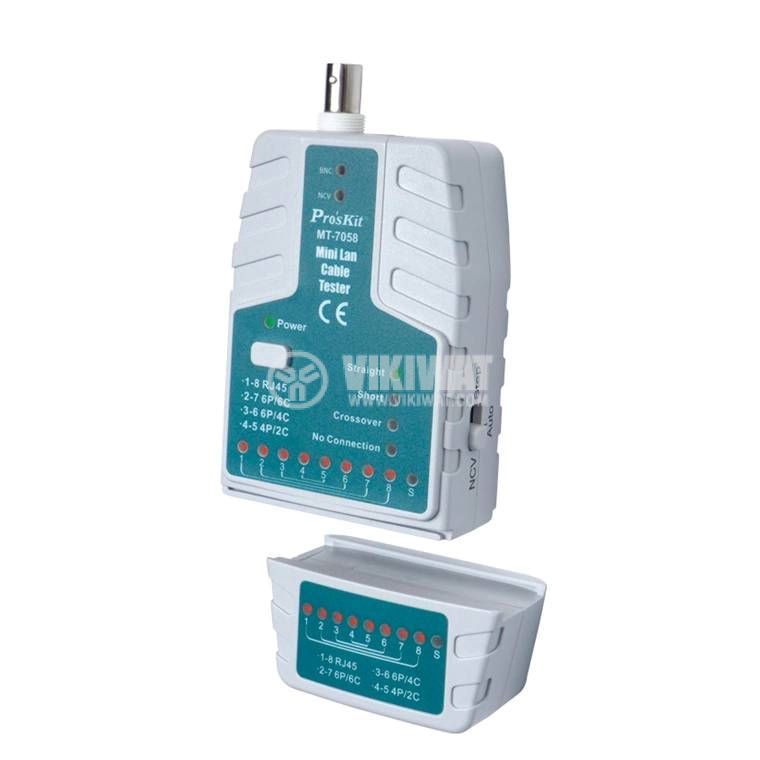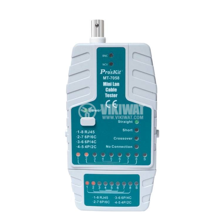 Тестер за мрежи MT-7058 на PRO'S KIT, за откриване на повреди, прекъсвания по LAN мрежи RJ11/RJ45, със светлинен LED индикаторни лампи. Захранване чрез батерия 9VDC (включена в комплекта).
