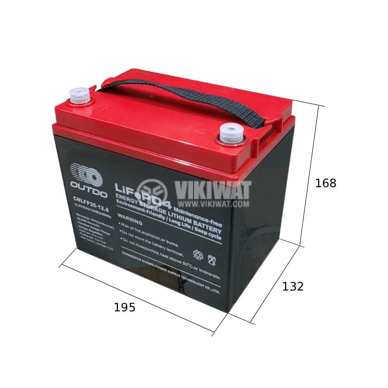Traction battery CNLFP35-12.8 from OUTDO, specially designed for energy storage, voltage and capacity 12.8 V / 33 Ah. Long life - over 1500 charge/discharge cycles and up to 2000 with proper use. Dimensions - 195x168x132 mm.