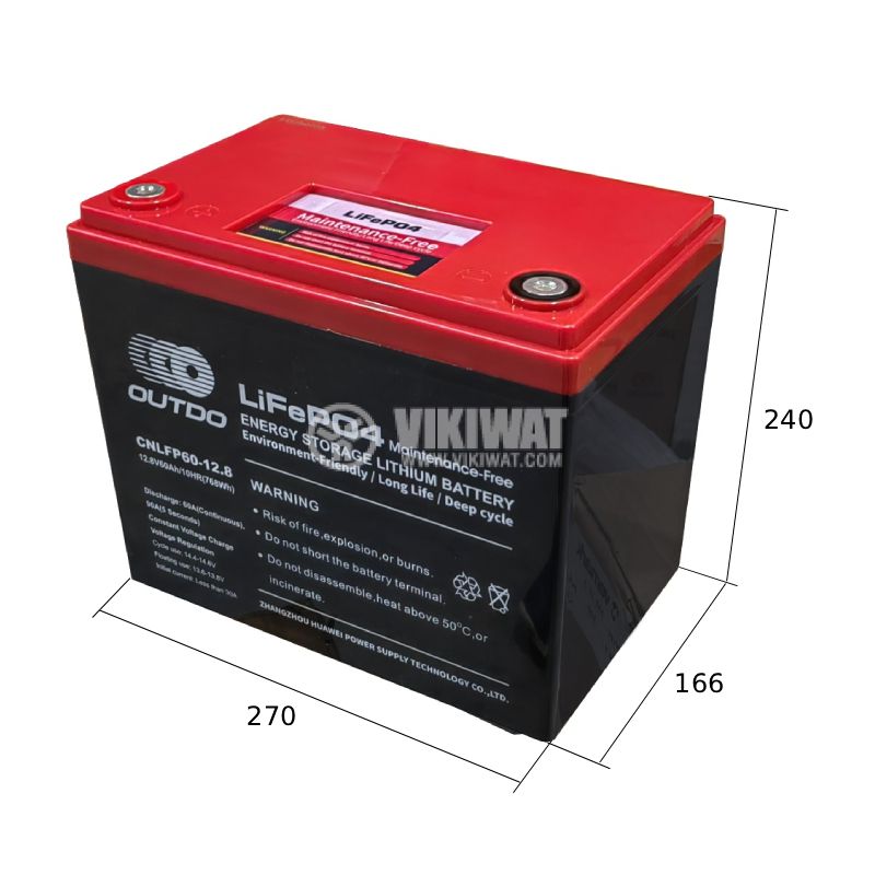 Traction battery CNLFP60-12.8 from OUTDO, specially designed for UPS power supplies, battery voltage and capacity 12.8 V / 60 Ah. Long life - over 1500 charge/discharge cycles and up to 2000 with proper use. Dimensions - 357x166x173 mm.