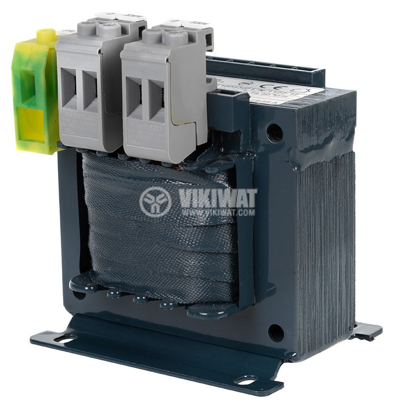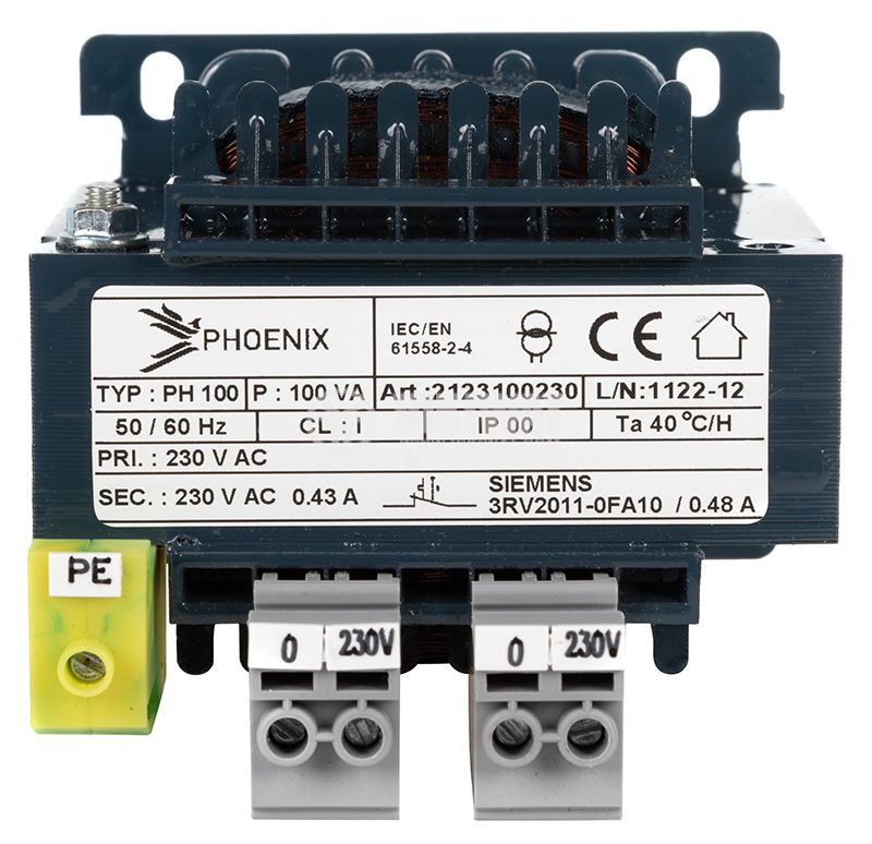 Transformer with a power of 100 VA, input voltage 230 VAC and output of the secondary winding 230 VAC.