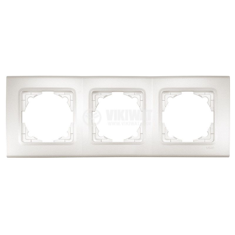 Тройна рамка, в цвят перла, за ел. ключове и контакти, от серия Linnera life на Viko Panasonic. Може да се комбинира с различни механизми oт същата серия. Новият изчистен дизайн в перлено бял цвят е подходящ за жилищни, търговски и офис сгради. 90483003-BG