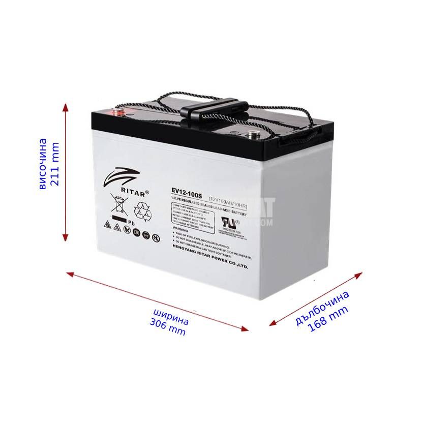 Тягов акумулатор EV12-100S оловно-киселинен, необслужваем, RITAR, 12 V / 100 Ah. Подходящ за аварийни захранвания, охранителни системи, електрически средства за придвижване и др. Размери - 306x168x211 mm. Презареждаема AGM, капсулована акумулаторна батерия, подходяща за електрически колички, голф колички, медицински роботи.
