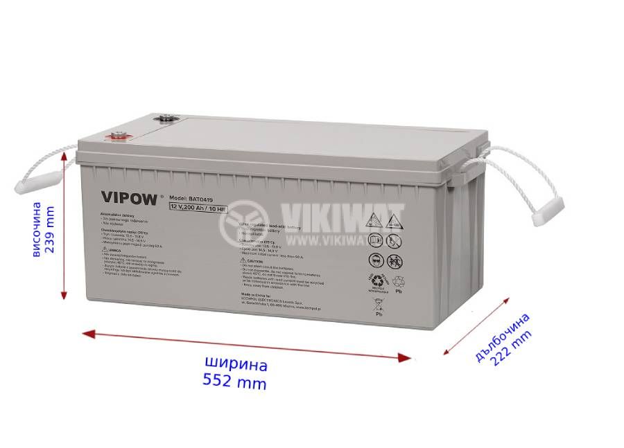 Гелов тягов акумулатор BAT0419, необслужваем, VIPOW, 12 V / 200 Ah. Подходящ за аварийни захранвания, охранителни системи, електрически средства за придвижване и др. Размери - 522x239x222 mm. Презареждаема, капсулована акумулаторна батерия, подходяща за соларни, фотоволтаични системи.