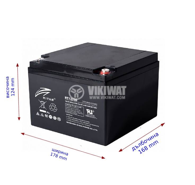 UPS акумулатор RT12260 оловно-киселинен, необслужваем, RITAR, на 12 V / 26 Ah. Тягов акумулатор подходящ за аварийни захранвания, с дълъг живот. Размери - 168x178x124 mm. Презареждаема, капсулована акумулаторна батерия.