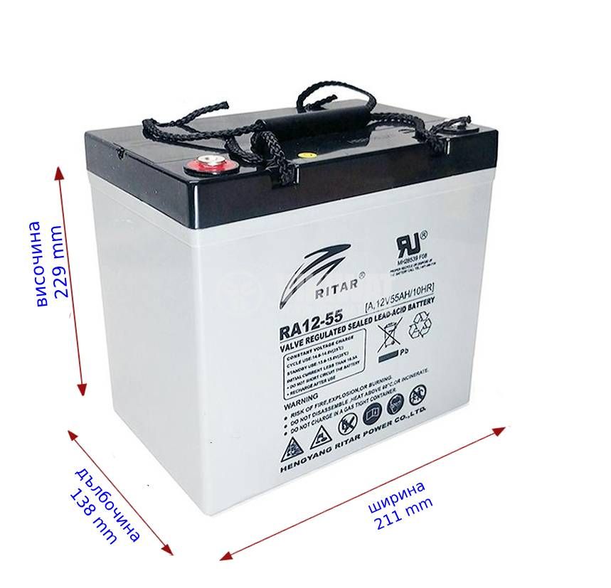 Тягов акумулатор DC12-55 оловно-киселинен, необслужваем, RITAR, 12 V / 55 Ah. Подходящ за аварийни захранвания, охранителни системи, електрически средства за придвижване и др. Размери - 229x138x211 mm. Презареждаема, капсулована акумулаторна батерия AGM, подходяща за соларни, фотоволтаични системи.