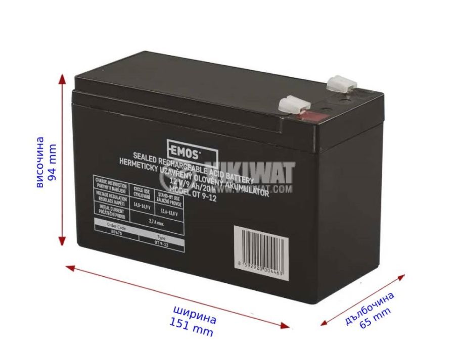 Тягов акумулатор B9675 оловно-киселинен, необслужваем, EMOS, 12 V / 9 Ah. Подходящ за аварийни захранвания, охранителни системи, електрически средства за придвижване и др. Размери - 151×65x94 mm. Презареждаема, капсулована акумулаторна батерия.