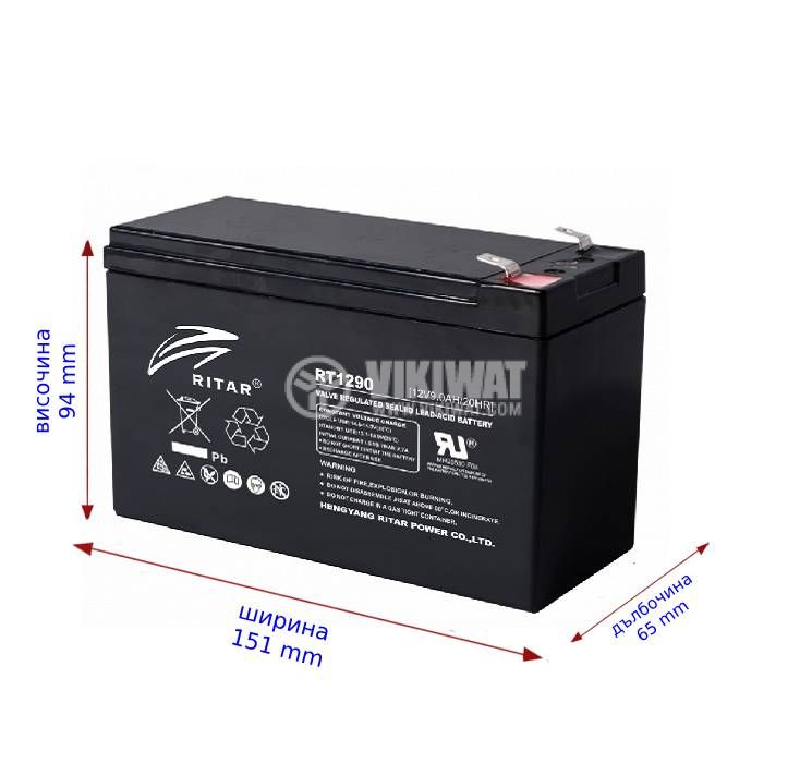 Тягов акумулатор RT1290 оловно-киселинен, необслужваем, RITAR, 12 V / 9 Ah. Подходящ за аварийни захранвания, охранителни системи, електрически средства за придвижване и др. Размери - 151x65x94 mm. Презареждаема, капсулована акумулаторна батерия.