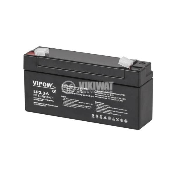 Гелов тягов акумулатор BAT0205 от VIPOW, специално създадена за съхраняване на енергия, напрежение и капацитет 6 V / 3.5 Ah. Подходящ за медицински уреди, преносими кантари, преносими източници на захранване. Габаритни размери 123x32x60 mm.