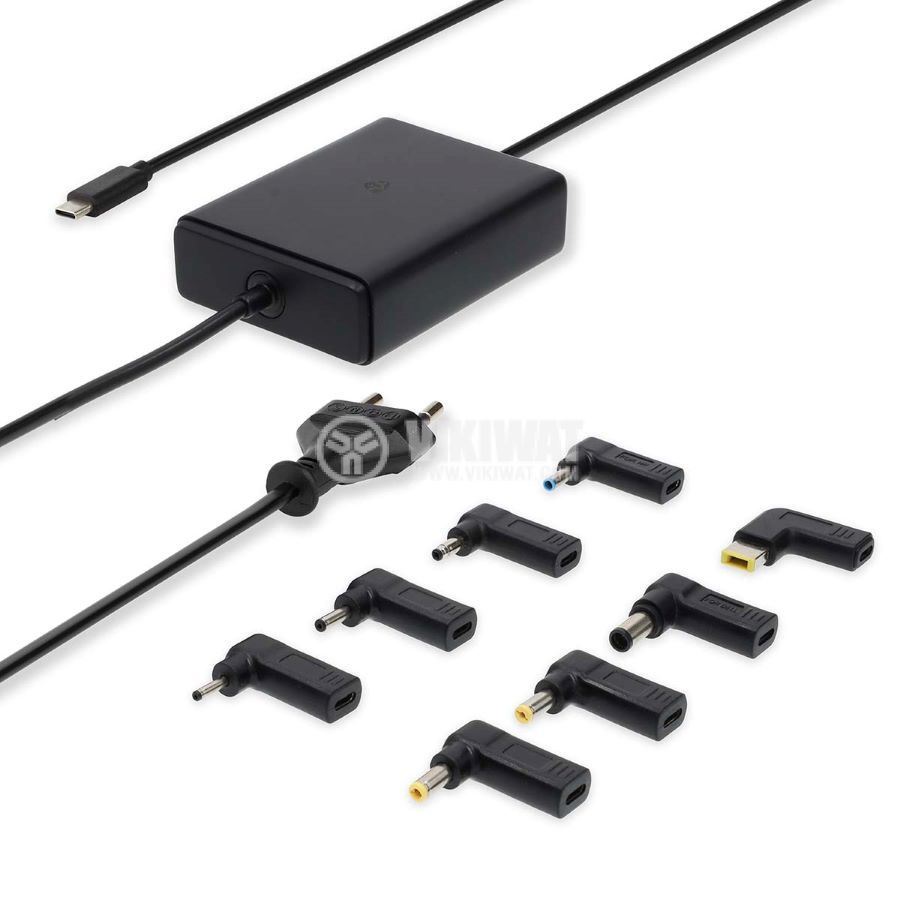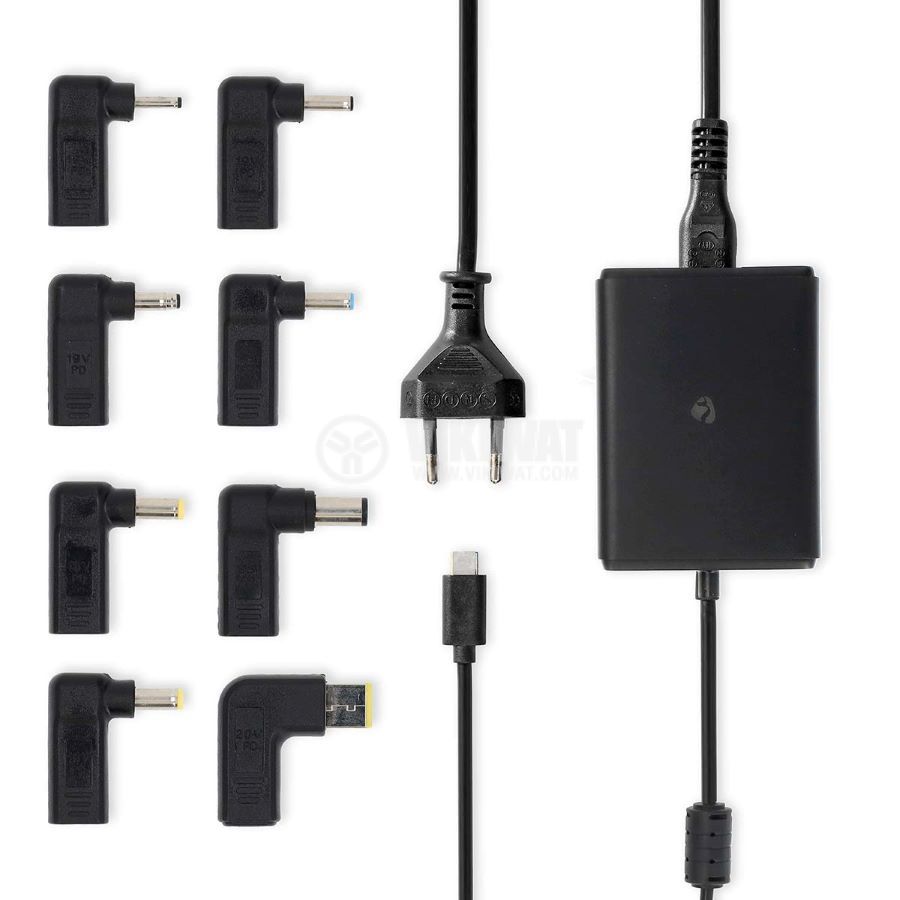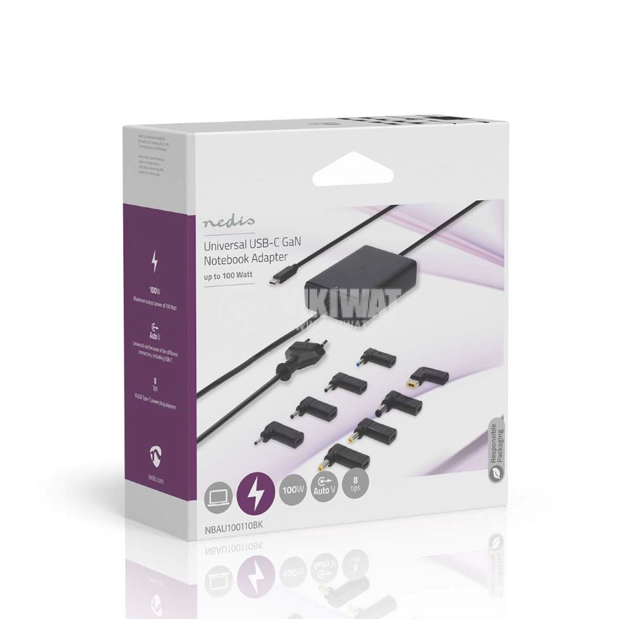 Universal charger NBAU100110BK from Nedis with nine different sockets, designed for charging laptops with a power of up to 100 W, with a voltage of 5 to 20 VDC, a maximum current of 5 A and a cable length of 1.5 m.