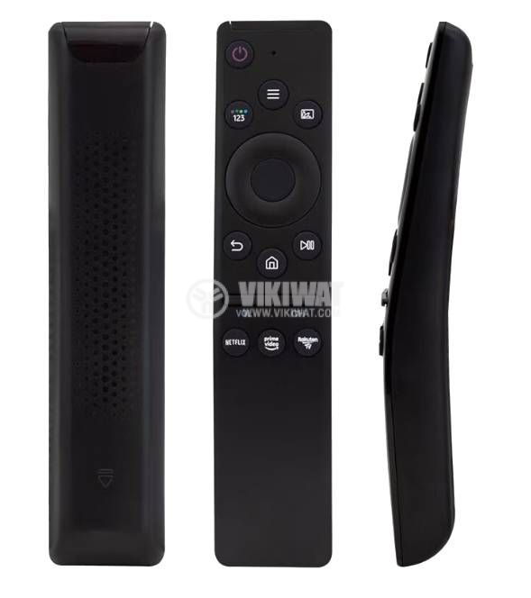 Universal remote control designed for smart TVs, with quick functions for NETFLIX, Prime Video. Power supply 2x AAA batteries (not included). The remote has a minimalist design and is suitable for SAMSUNG TVs.