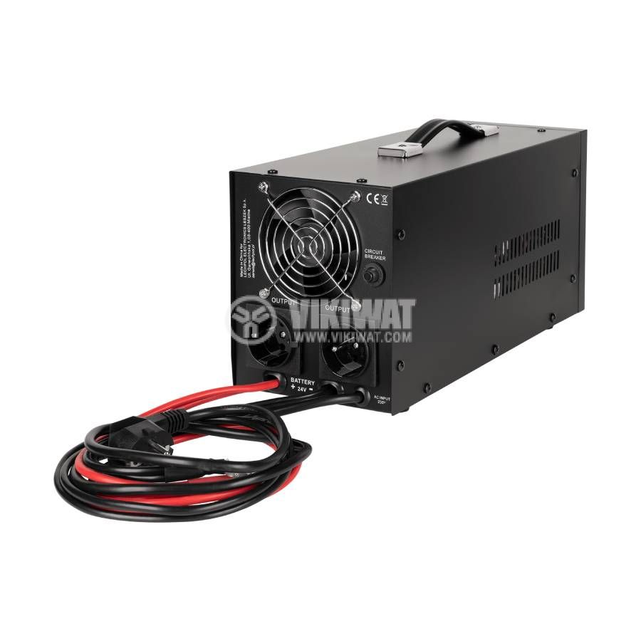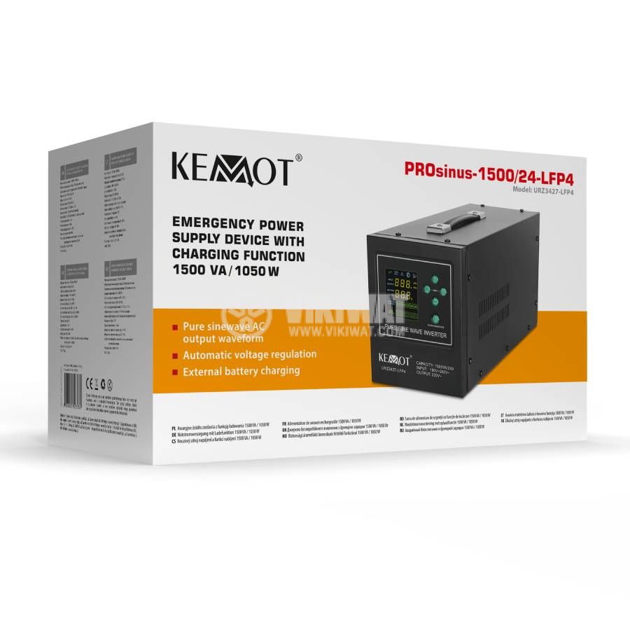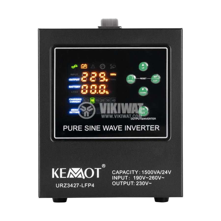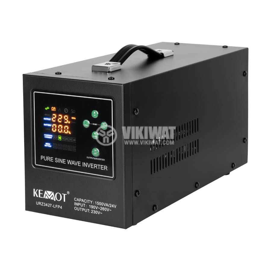 Uninterruptible power supply (UPS), URZ3427-LFP4, from KEMOT, full sine wave with low frequency 45~60 Hz, external battery up to 55 Ah (24VDC) and output power 1050 W. Emergency power supply for local heating circulators, pellet burners, and other electrical appliances. Do not connect to starter batteries.