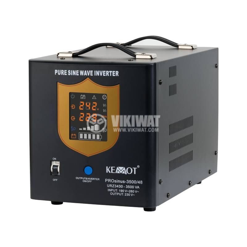 Аварийно захранване (UPS), URZ3430, от KEMOT, пълна синусоида с ниска честота - 50 Hz, външен акумулатор до 300 Ah (48 VDC) и изходяща мощност 2400 W. Аварийно захранване за циркулационни помпи за локално парно, пелетни горелки, както и други електроуреди. Да не се свързва със стартови акумулатори.