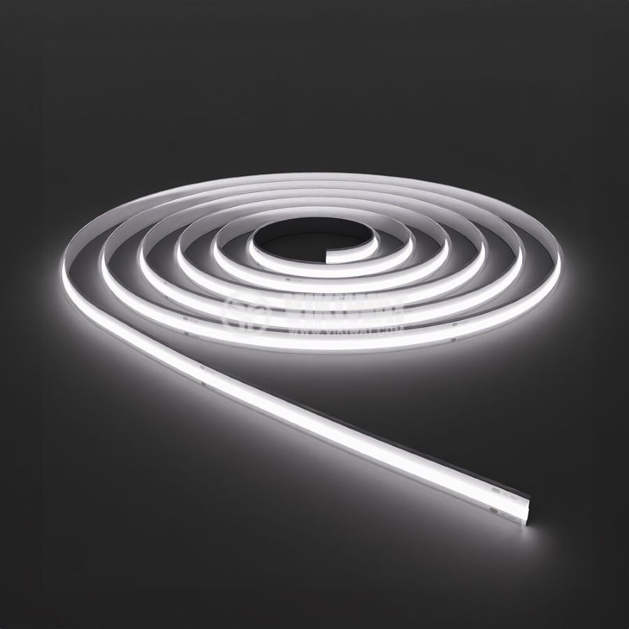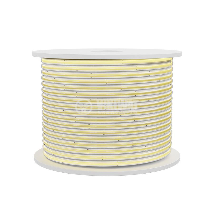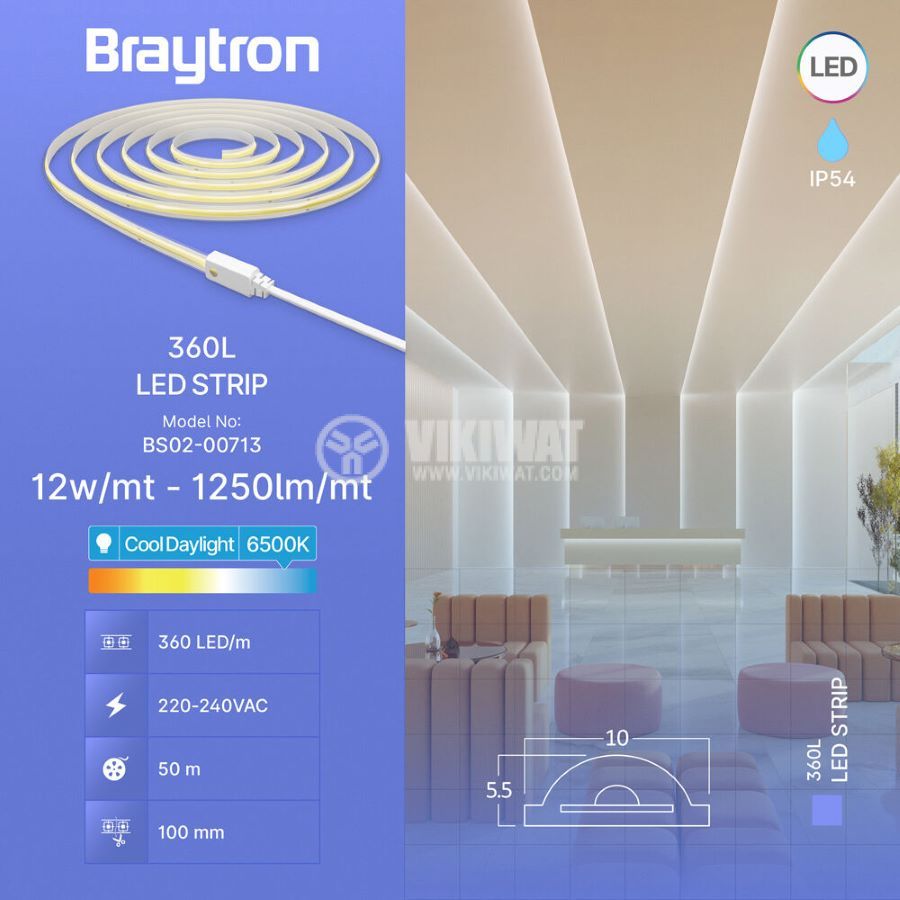 Влагозащитена, гъвкава светодиодна LED COB лента от Braytron с 360 диода на метър, със захранващо напрежение 230 VAC и мощност 12 W / m, светеща в студено бяла светлина от 6500 K и светлинен поток 1250 lm.. Подходяща за декоративно осветление, sтепен на защита IP54. Цената е за 1 линеен метър.
