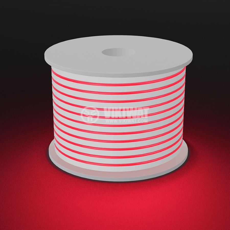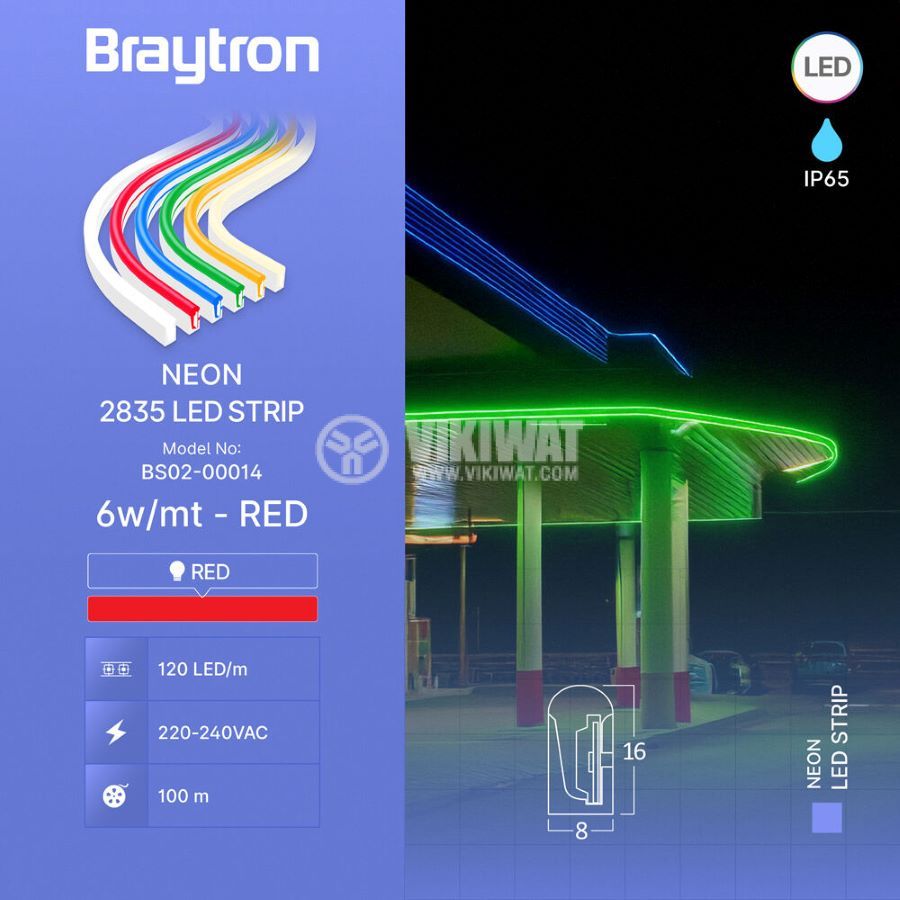 Влагозащитена, гъвкава светодиодна неонова LED лента от Braytron, със захранващо напрежение 230 VAC, kонсумирана мощност 6 W / m светеща в червена светлина със светлинен поток 550 lm. Подходяща за декоративно осветление.