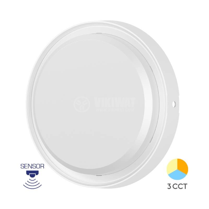 Влагозащитен LED плафон в кръгла форма на Braytron с мощност 18 W, светлинен поток 2020 lm. Подходяща опция за осветление във влажни помещения, работилници, коридори, тераси. Не се димира и има сензор за движение.