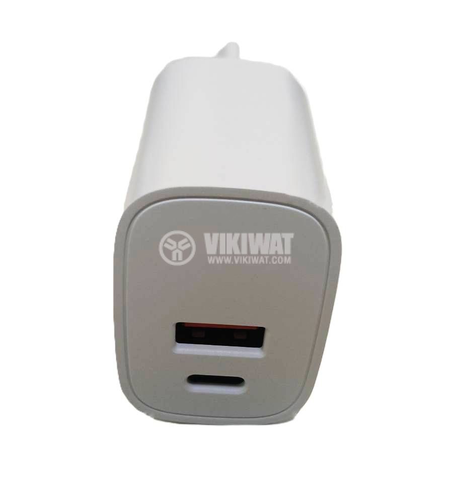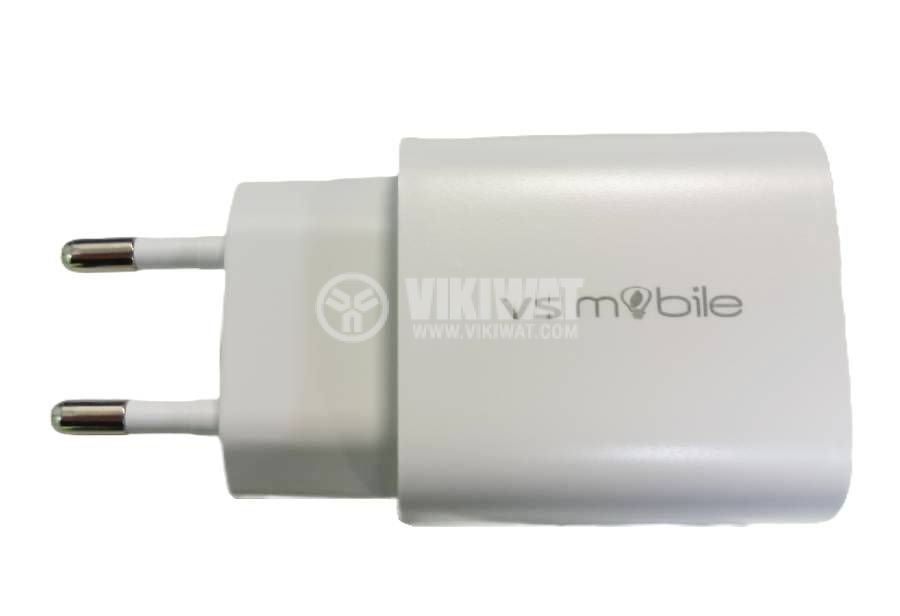 Зарядно за телефон с USB портове от VS Mobile с бял цвят за зареждане на устройства като телефони, смартфони, таблети, слушалки, тонколони и много други.
